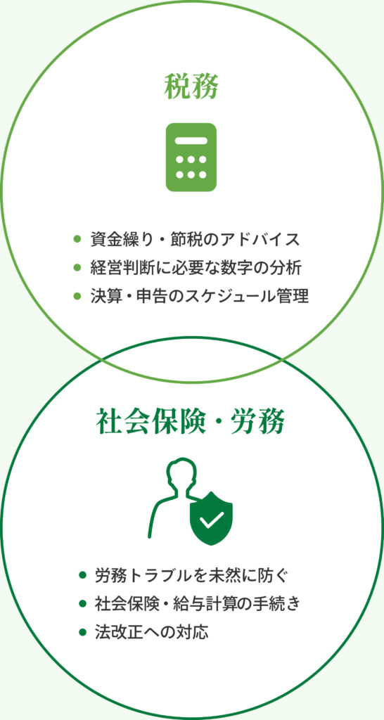 「これは税理士?社労士?どちらに相談したらいいの?」と迷うことなく、安心してご相談ください。